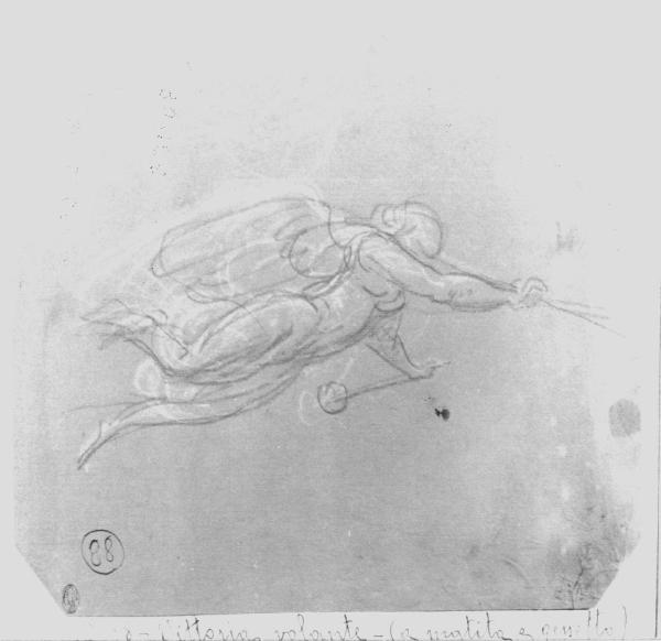 - NOTIZIE STORICO CRITICHE Il disegno rappresenta la figura della Fama, particolare di una più ampia e articolata composizione allegorica di soggetto napoleonico. IL 23/03/1801 il comitato di Governo della seconda Repubblica Cisalpina bandì un concorso di pittura rivolto ai migliori artisti italiani, tra cui Appiani, con tema "La gratitudine del popolo cisalpino a Napoleone" (il vincitore risultò Bossi). Del dipinto di Appiani, documentato ma non inviato alla giuria, rimane un disegno preparatorio complessivo e altri disegni di particolari.\n\nAl verso studio del busto di una figura maschile in abiti contemporanei, forse per la figura di Napoleone per i Fasti napoleonici.