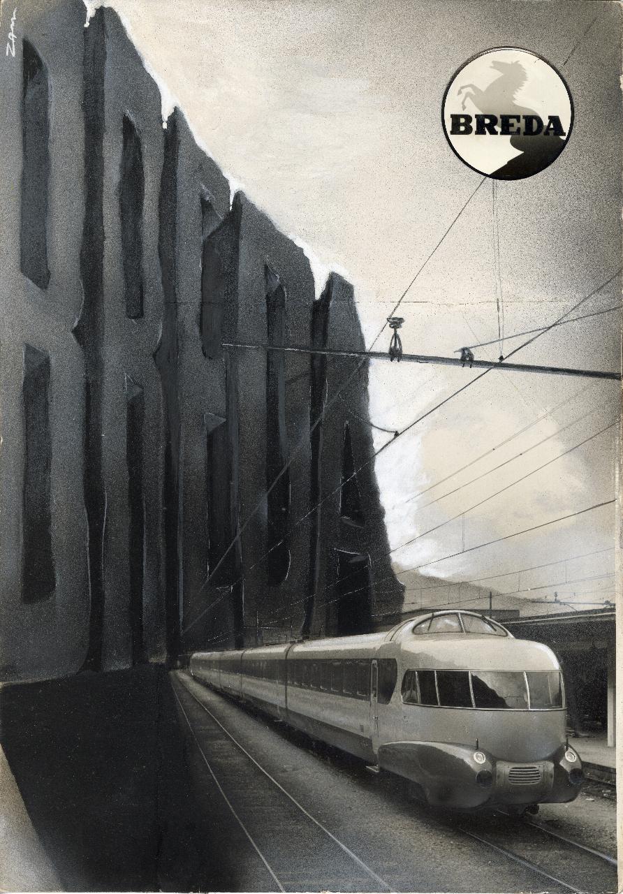 Bozzetto dell'elettrotreno "Arlecchino" per campagna pubblicitaria della Società Breda. elettrotreno in movimento, sagoma di cavallino rampante, iscrizioni