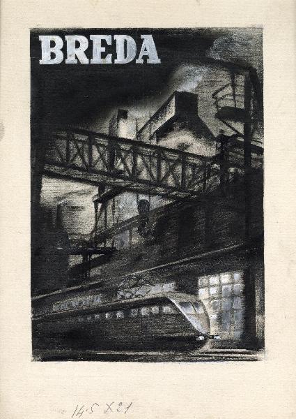 Bozzetto per campagna pubblicitaria della Società Breda. elettrotreno, struttura metallica, fabbrica con ciminiere e iscrizione