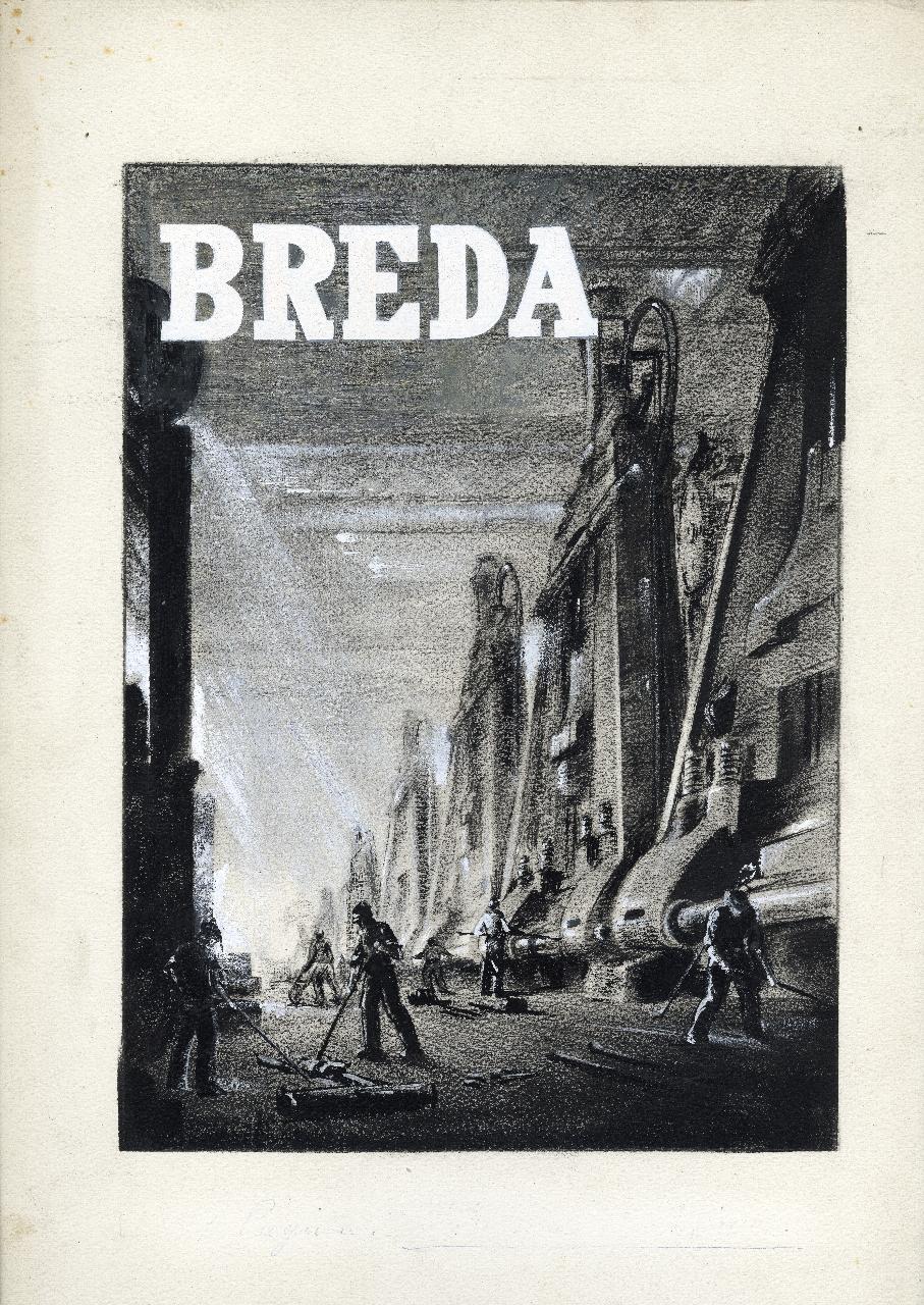Bozzetto di interno di fucina per campagna pubblicitaria della Società Breda. operai al lavoro all'interno di una fucina, iscrizione
