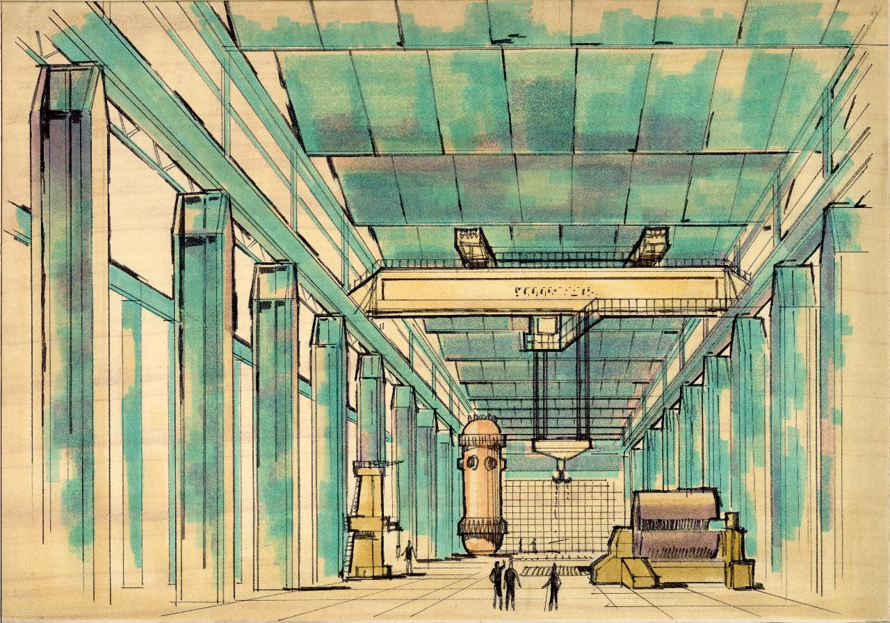 Bozzetto di interno di fabbrica per campagna pubblicitaria della Società Breda. interno di fabbrica con carro ponte, caldaia e macchinari