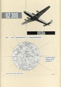 Layout di annuncio pubblicitario dell'aereo BZ 308 della Società Breda. aereo, volta celeste con segni zodiacali, righe di testo e iscrizione