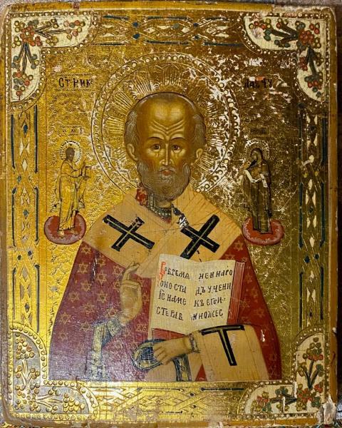Icona russa raffigurante San Nicola con la destra benedicente, sostiene con l'avambraccio sinistro il Vangelo aperto, su cui è scritto "In quel tempo si fermò in un luogo pianeggiante..." (Luca 6,17). Ai lati del volto a sinistra Gesù Cristo e a destra la Madre di Dio che restituiscono a Nicola le insegne vescovili, sottratte quando fu imprigionato perché si era opposto all'eresia di Ario.