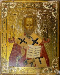 - NOTIZIE STORICO CRITICHE San Nicola è tra i santi più venerati in Russia. Il suo nome è ugualmente ed ampiamente diffuso sia in Oriente, dove visse ed operò, sia in Occidente, dove sono conservate le sue sacre reliquie. La storia del santo è accompagnata da una ricchissima letteratura agiografica, di cui è possibile ricordare soltanto alcuni momenti salienti. Nato a Patara nel 280, la tradizione narra che il santo fin dalla nascita rispettava i digiuni imposti dalla regola ortodossa, rifiutando il latte materno fino al tramonto nei giorni di mercoledì e venerdì. Inoltre pare che egli, ancora neonato si reggesse perfettamente in piedi; una volta adulto aveva ricevuto una cospicua eredità dai genitori che distribuì ai poveri. Fu vescovo di Myra, in Licia, dove morì tra il 345 e il 352. Al concilio di Nicea si oppose vivacemente al vescovo eretico Ario, fu spogliato dalle sacre insegne e incarcerato, ma Cristo e la Vergine gli apparvero restituendogli la libertà e la dignità vescovile, confermandolo nella vera fede. \nL'iconografia russa prevede due fondamentali tipi di raffigurazione del taumaturgo: con la mitra, secondo la denominazione popolare "Nicola d'inverno", giacché la Chiesa Ortodossa, commemora San Nicolail 6 dicembre, nel giorno della morte; senza mitra, il cosiddetto "Nicola d'estate", perché collegato alla festa del 9 maggio, in cui si ricorda il trasferimento delle spoglie del santo a Bari.\nL'icona in analisi raffigura San Nicola d'estate, senza mitra. La sua iconografia classica lo ritrae a mezzo busto, in abiti vescovili, avvolto nell'omorphorion ornato di cornici, benedicente e con il Vangelo aperto in mano. La fermezza del volto, la fronte alta e solcata dalle rughe, i grandi occhi concentrati segnati dalle folte sopracciglia, la corta barba, fanno di Nicola l'immagine del difensore della fede cristiana contro l'eresia oltre che l'esorcista e il guaritore.