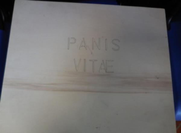 Pani modellati e patinati in forma e aspetto realisti. L’insieme della scultura è custodita in una scatola di legno preparato ad hoc dall’artista. La scultura è stata realizzata in occasione della mostra “Il Pane. Cibo per la vita dal 1500 ad oggi” (28/09/2013 – 08/12/2013). I tre pani, di cui uno spezzato, sono al vero e posti sopra un piatto tondo e liscio anch’esso in terracotta. Gli elementi simbolici sono: il numero tre, il pane spezzato, il cerchio del piatto.\n