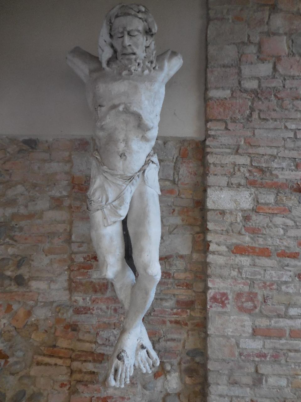 Il Cristo Crocifisso è stato realizzato in gesso, in scala reale ed è il modello di base per la realizzazione della copia per la fusione in bronzo a cera persa che si trova nel Cimitero di Bolgare (BG). Il modello al vero permette una lettura più dettagliata degli elementi che \ncaratterizzano il morente: il volto eretto e non reclinato, la bocca semi aperta, l’evidenza dei corrugatori del sopracciglio, i piedi fissati singolarmente. L’opera si impone per la forte monumentalità dovuta alla dimensione e alla intensa modellazione nonostante la voluta assenza degli arti superiori.\n\n\n