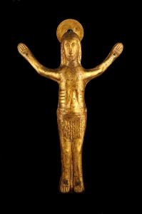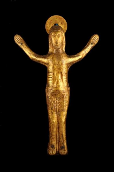 Nella seconda parte degli anni '60 del XX secolo, la Parrocchia si S. Maria Assunta e S. Giacomo Apostolo di Romano di Lombardia, commissionarono allo scultore questo Crocifisso. Il Cristo appare senza croce, con le braccia allargate, completamente dorato che lo colloca in una dimensione metafisica. L'anatomia nell'insieme non è dettagliata ma sintetizzata e deformata per ottenere una lettura soprattutto simbolica. Sono degni di nota: il volto in una posa ieratica e il perizoma piuttosto elaborato.\nL'opera si presenta come un rilievo ma senza fondo.\n