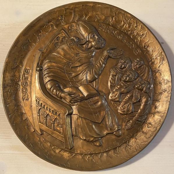 La scena raffigura il Santo che, dalla cattedra episcopale, sta istruendo il popolo sulle verità fondamentali della fede cristiana. Gli elementi allegorici – le vesti e la cattedrale – caratterizzano il magistero vescovile. L’opera ricorda il periodo dell’arte medievale.\n\n