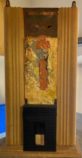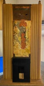 Il pannello presenta nella parte centrale il bassorilievo realizzato con mastice policromo e incorniciato da una parete architettonica, formata da due larghe strutture verticali sagomate, appoggiate su un solido basamento di legno.\nComposizione assemblata con materiali di recupero.\n\n\n