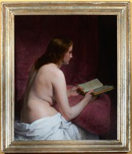 Dipinto raffigurante nudo accademico di donna seduta, volta di profilo, con drappo panneggiato in vita, in atto di leggere un libro illustrato appoggiato in primo piano su un cuscino rosso; drappo dello stesso colore sul fondo.