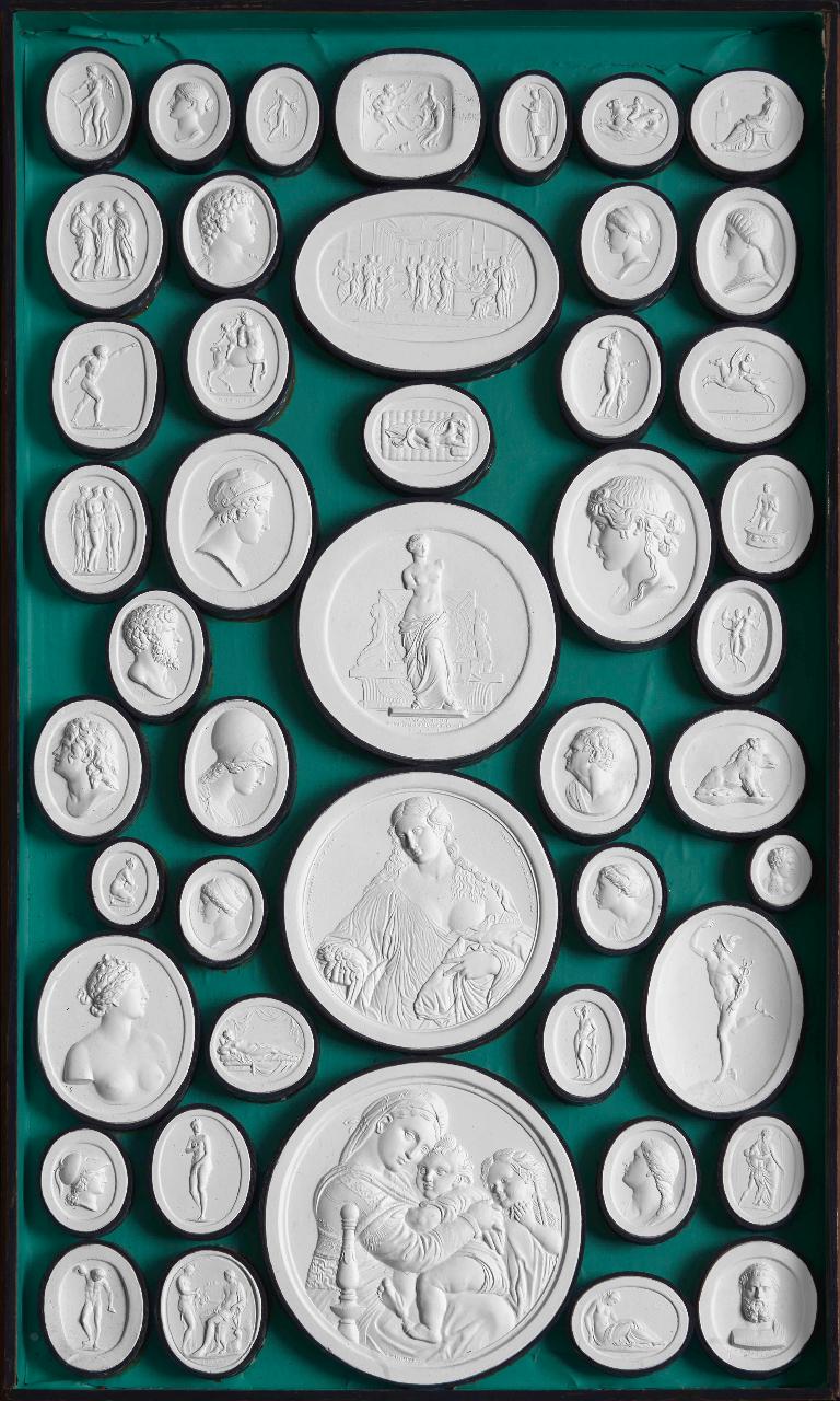- NOTIZIE STORICO CRITICHE L’insieme fa parte di una collezione di quattrocentottanta impronte in scagliola tratte da altrettante pietre incise, montate in sedici cassette impilabili in legno di faggio. La raccolta rappresenta un significativo esempio della diffusione e della commercializzazione di calchi di pietre incise nel contesto del collezionismo ottocentesco. Riproducendo celebri opere d'arte conservate nei principali musei europei, nonché capolavori della collezione di Giovanni Battista Sommariva e di altri gabinetti privati, essa testimonia il ruolo cruciale della glittica nella cultura visiva e antiquaria del tempo. Secondo l'etichetta originale, essa fu realizzata intorno al 1820 dall'incisore romano Giovanni Liberotti, noto per la qualità tecnica delle sue riproduzioni.\n