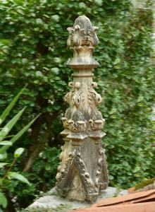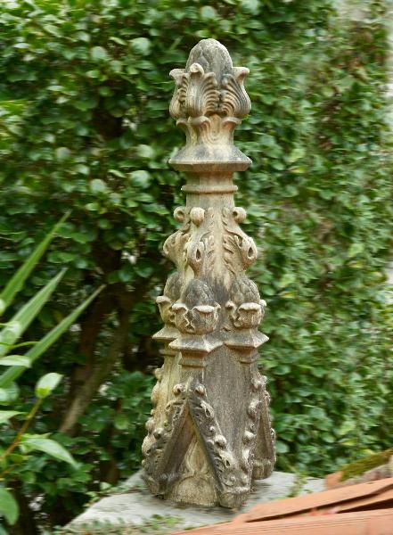 Guglia in marmo di Candoglia a base quadrata decorata su quattro lati con intricati motivi floreali e fogliame a rilievo, tipici dello stile gotico. La parte superiore della guglia presenta una forma a pigna con decorazioni a rilievo, mentre la parte inferiore è caratterizzata da elementi architettonici.\n