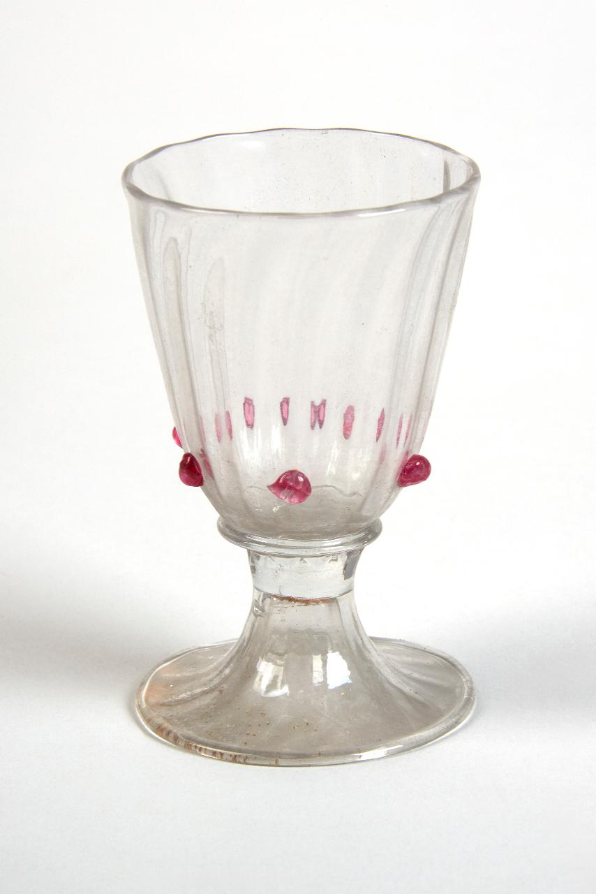 Calice con coppa larga e affusolata, bocca più stretta del piede. La struttura, in vetro trasparente, è troncoconica, modellata da sinuose scannellature ed è decorata con perline rosa alla base della calice.