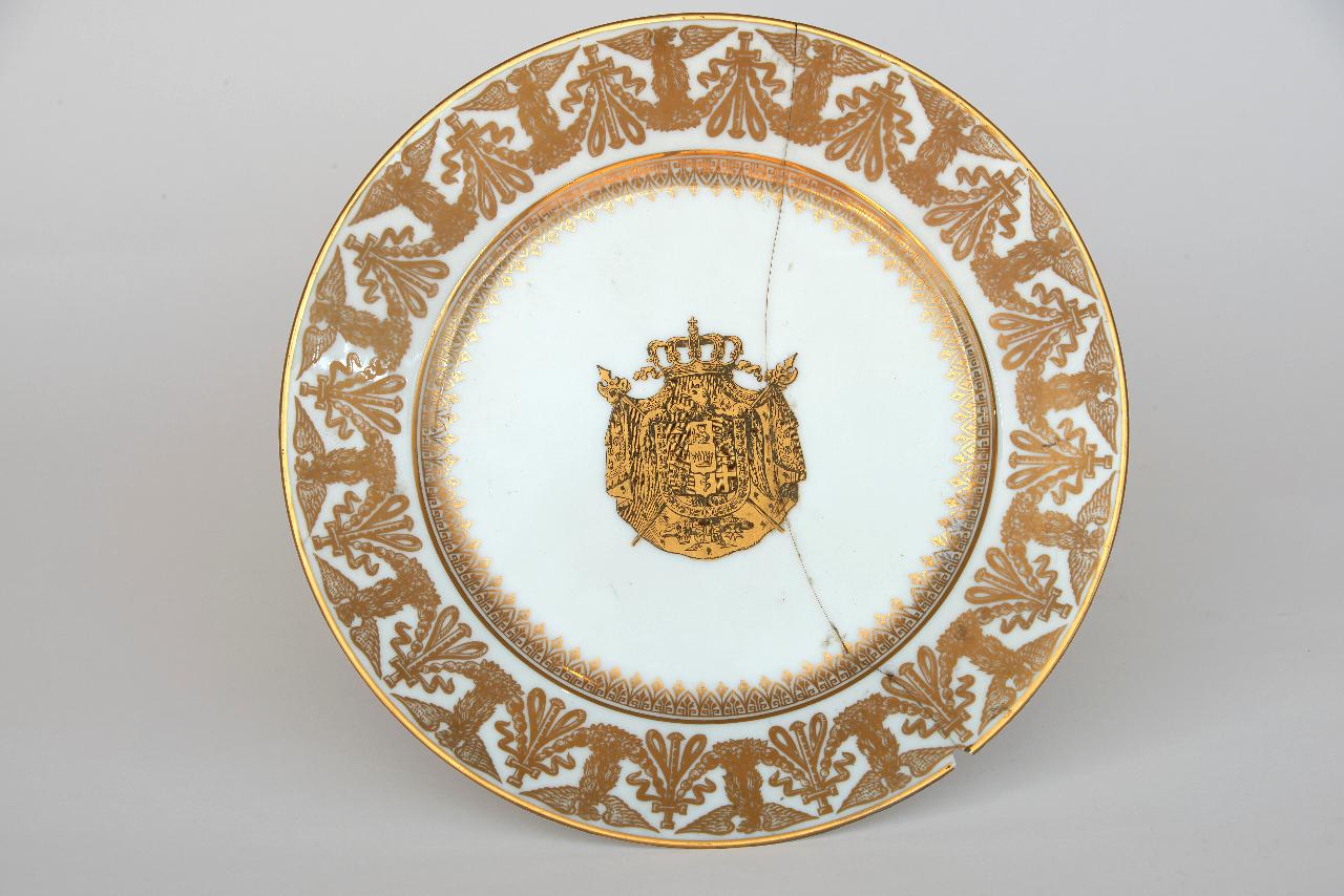 - NOTIZIE STORICO CRITICHE Il piatto proviene dalle collezione del Duca d'Aosta è stato donato a Villa Carlotta da Giuseppe Bianchini. Questo piatto, che presenta lo stemma del Regno d'Italia napoleonico, è stato prodotto dalla Manufacture nationale de Sèvres, una delle più celebri e antiche manifatture di porcellana in Europa