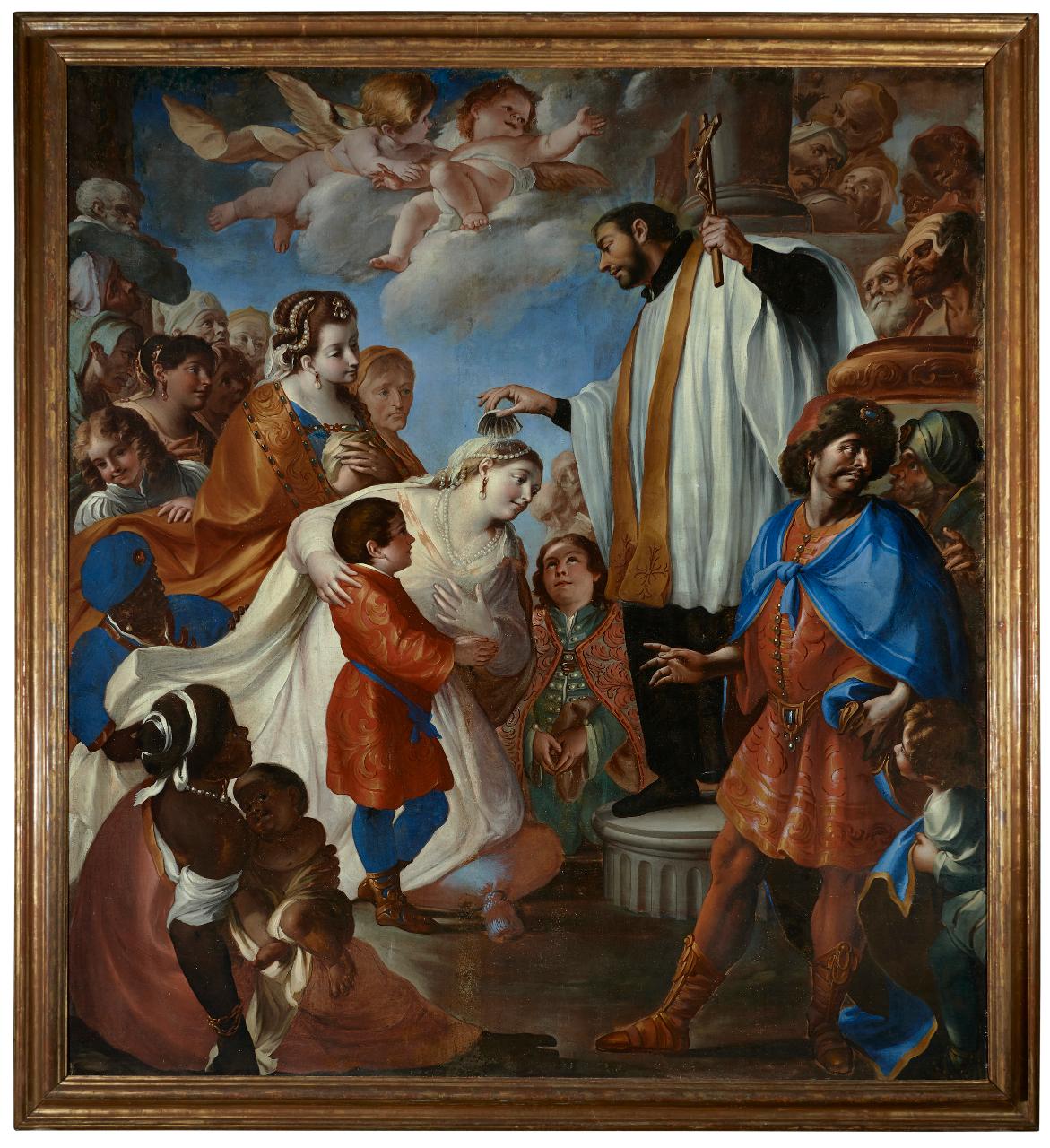 Il dipinto raffigura una scena religiosa. Al centro un uomo in abiti liturgici sta benedicendo una donna inginocchiata, con indosso un abito bianco, circondata da un gruppo di astanti. Alcune figure sono vestite con abiti ricchi e colorati. Ci sono fanciulli e personaggi di diverse etnie. Sopra la scena, come sospesi, alcuni cherubini osservano la scena. A destra alcuni personaggi di rango, ritratti con espressioni di sgomento.