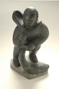 Inuk che uccide un pesce di grandi dimensioni, indossa il tipico abito maschile composto da parka (kuletak) e pantaloni (karlik).\nCome da descrizione in elenco.