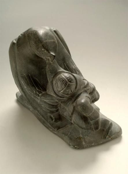Statua di Inuk che viene rapito da un'aquila gigante che lo trascina dal cappuccio.\nCome da descrizione in elenco.