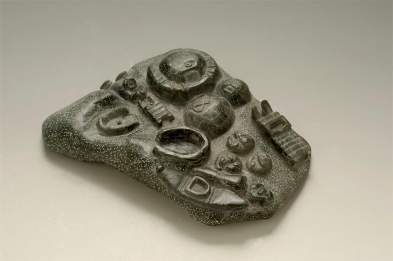 Scultura rappresentante un villaggio invernale inuit composto da tre igloo, due ripari in ghiaccio, un Inuk, quattro cani acciambellati, due slitte, un qayaq.\nCome da descrizione in elenco.