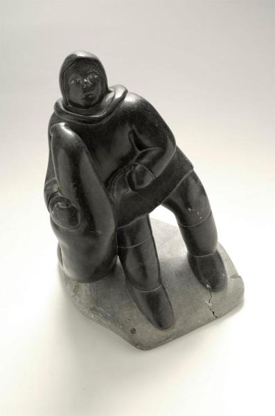 Scultura rappresentante un Inuk che attende pazientemente che la foca venga a respirare attraverso i fori che ha praticato nel ghiaccio. Una posizione classica: il cacciatore scruta pazientemente ogni piccolo segnale di avvicinamento della foca.\nCome da descrizione in elenco.