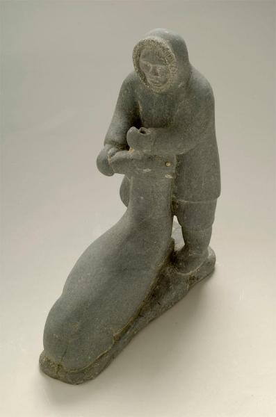 Scultura rappresentante un uomo che uccide un caribù (alce), in mano tiene un coltello in osso; l'alce ha un foro sulla testa, con all'interno un pezzo di legno (che rappresenta uno dei due corni).\nCome da descrizione in elenco.