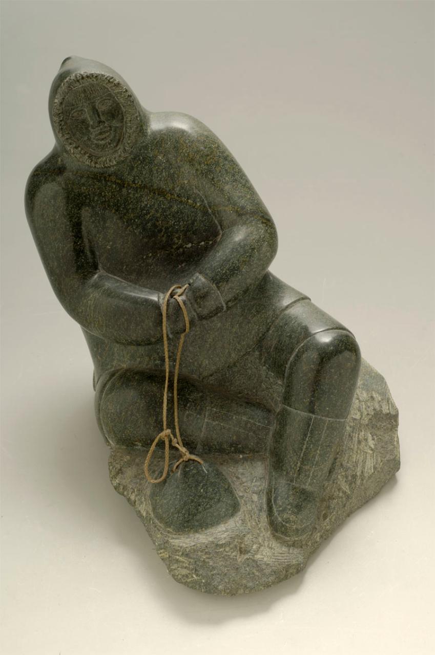 l'Inuk attende pazientemente che la foca venga a respirare attraverso i fori che ha praticato nel ghiaccio. Una posizione classica: il cacciatore scruta pazientemente il più piccolo segnale di avvicinamento della foca.\nCome da descrizione in elenco.\n