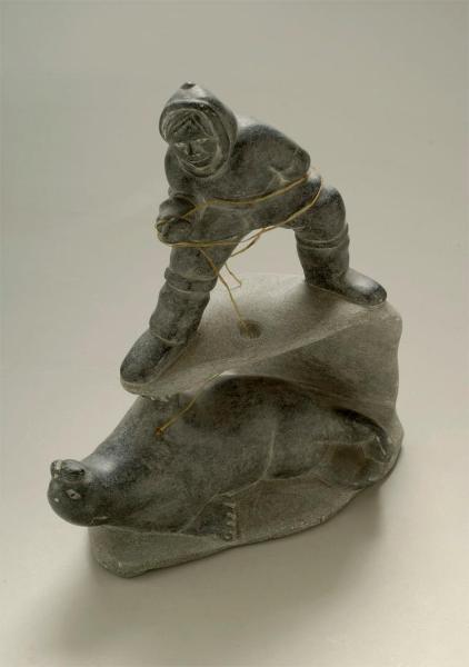 L'inuk attende pazientemente che la foca venga a respirare attraverso i fori che ha praticato nel ghiaccio. Una posizione classica: il cacciatore scruta pazientemente ogni piccolo segnale di avvicinamento della foca.\nCome da descrizione in elenco.