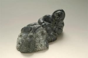 L'Inuk attende pazientemente che la foca venga a respirare attraverso i fori che ha praticato nel ghiaccio. Una posizione classica: il cacciatore scruta pazientemente il più segnale di avvicinamento della foca.\nCome da descrizione in elenco.