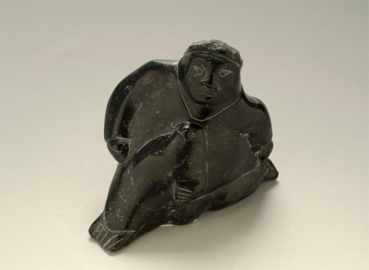 statua di Inuk inginocchiato (indossa il tipico abito maschile: kuletak, parka e kalik, pantaloni); appoggiata davanti ai suoi piedi c'è una piccola foca.\nCome da descrizione in elenco.