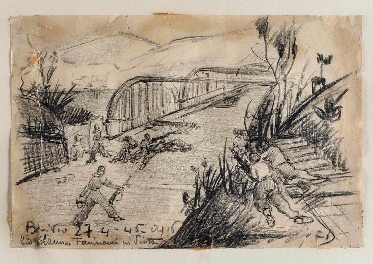 Sulla strada che porta al ponte di Brivio, di cui si vedono le arcate, alcuni partigiani armati si preparano all'attacco: sul fondo si delineano profili di montagne.\n
