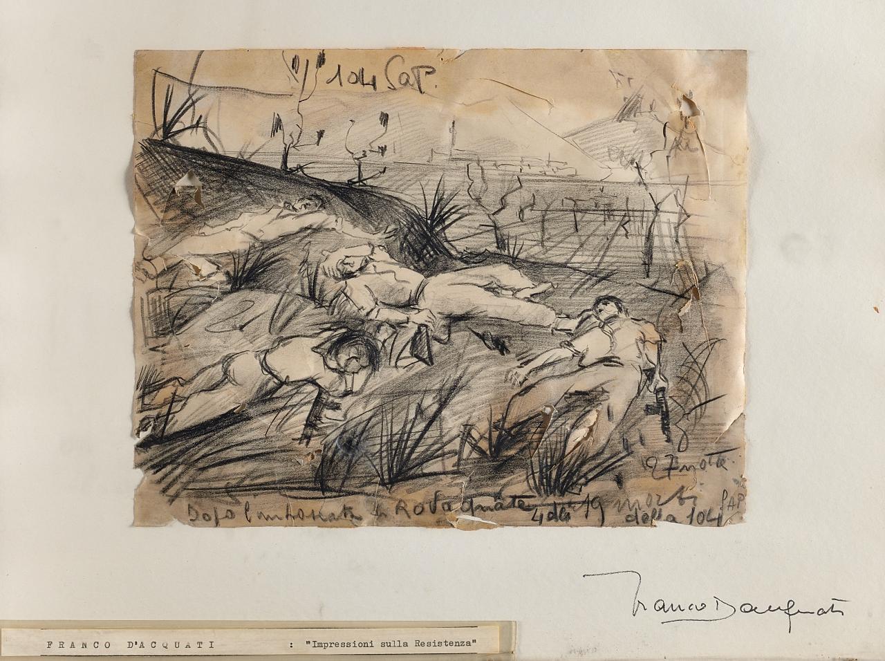 - NOTIZIE STORICO CRITICHE Il disegno è incorniciato insieme a un altro dello stesso autore con tema simile ("Brivio 27.4.45 ore 16 la colonna Farinacci in vista") e in basso sul passe-partout è presente un'etichetta che riporta FRANCO D'ACQUATI "Impressioni sulla Resistenza". Il cartellino è simile a quello presente in un altro quadro, sempre conservato in Casa della Memoria, nel quale sono collocati altri due disegni di Dacquati ("Il nostro autocarro brucia sulla strada di Lecco dopo uno scontro con i tedeschi in fuga" e "Sul ponte di Brivio ore 17,35 arrivano gli americani!") e che sotto riporta su un'etichetta "Mostra del 1° e 2° Risorgimento". Quindi questo disegno, insieme agli altri tre a esso collegati, potrebbe, aver fatto parte della selezione espositiva della rassegna tenuta a Milano nel 1946 ("Mostra del 1° e 2° Risorgimento") oppure essere stato un'idea per un bozzetto per il manifesto dell'esposizione, per il quale Dacquati lavorò, come testimoniato da un bozzetto per manifesto sempre conservato in Casa della Memoria; non si tratta comunque di un'etichetta collocata dall'artista, considerata la scrittura errata del nome (D'Acquati e non Dacquati).\nLo stato di conservazione del disegno, come degli altri tre a esso collegati, fa immaginare una sua sofferta sopravvivenza in circostanze difficili, forse proprio quelle del 1945, quando potrebbe essere stato eseguito divenendo una significativa e preziosa testimonianza storica.\nUn altro dei cartellini visibili sul retro, quello dentellato coperto da un cartellino successivo, appare perfettamente accomunabile con le etichette, del tutto simili ma con diversa numerazione, di altre opere della raccolta ANPI: questo rilievo suggerisce che l'opera, insieme alle altre così caratterizzate, potesse aver fatto parte o di un gruppo di lavori archiviati precedentemente con conseguente numerazione o della selezione espositiva di una ulteriore mostra. Su di essa è per ora possibile solo dire che, considerati i contenuti delle opere con questo cartellino, non dovrebbe essersi trattato di una mostra-vendita ma di una esposizione dedicata specificamente al tema della Resistenza; per quanto concerne la data di questa probabile rassegna, è da fissare a dopo il 1960, per la data della tela di Salvatore Blasco con identico cartellino.\nFranco Dacquati nasce a Milano nel 1910, dove studia e si diploma all'Accademia di Brera; tra il 1942 e il 1944 compie reportage d'arte sul fronte di guerra. Tra 1946 e 1952 cura una rubrica sulla rivista "Corriere degli artisti". Il suo percorso espressivo è presentato in diverse mostre personali, mentre partecipa a importanti collettive, come la Biennale di Milano, dove è presente nel 1950 e nel 1958. Ha svolto attività di insegnamento e alcune delle sue opere sono conservate al Museo del Risorgimento di Milano. La sua arte si sviluppa in un ambito di figurazione nel quale ricorrente è il tema della figura, particolarmente femminile: l'opera di proprietà ANPI appartiene a una cospicua serie di lavori dell'artista conservati in Casa della memoria e dedicati alle tematiche della Resistenza. L'artista è morto a Milano nel 1988\n
