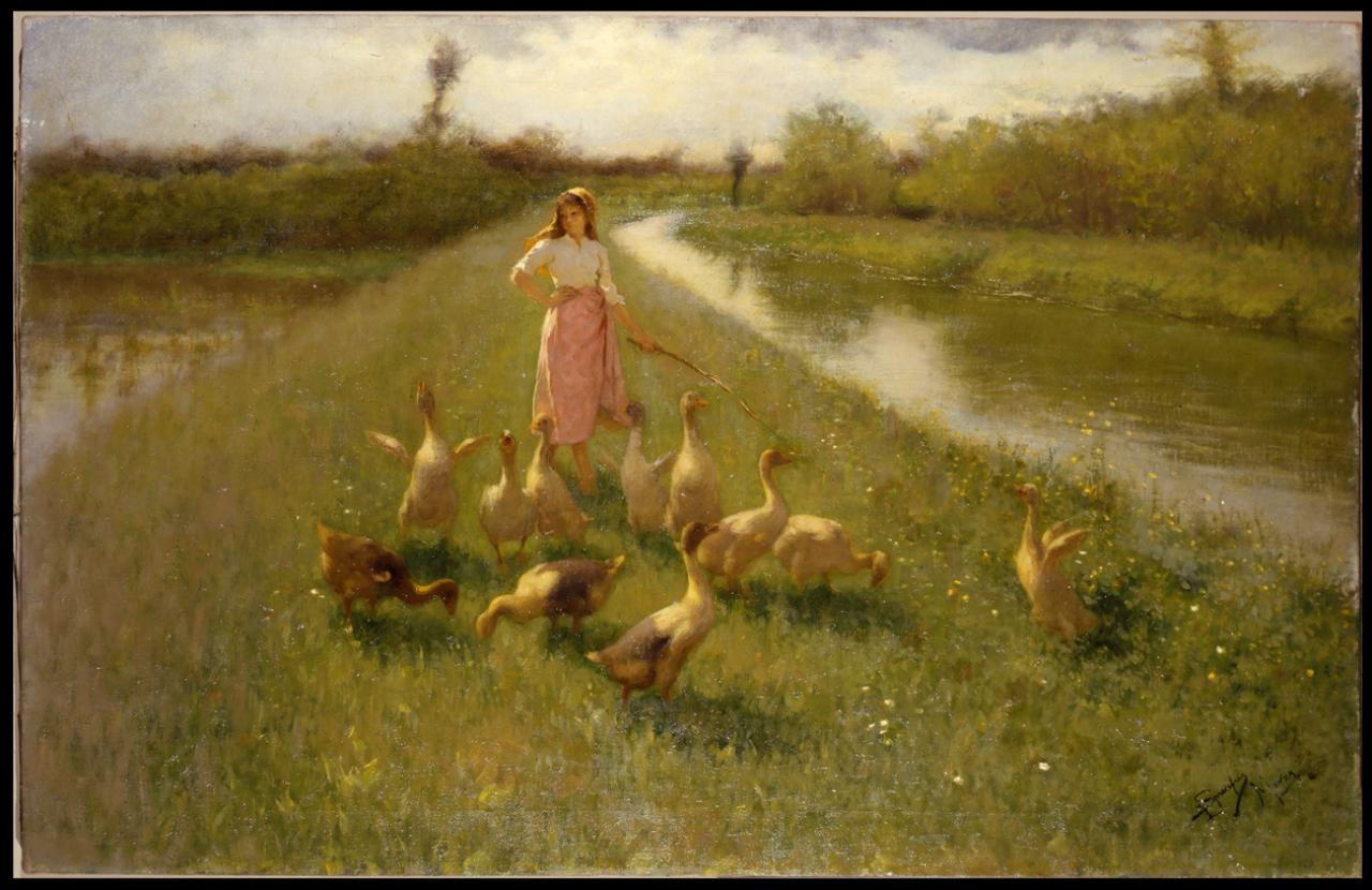 La guardiana delle oche. paesaggio campestre con figure
