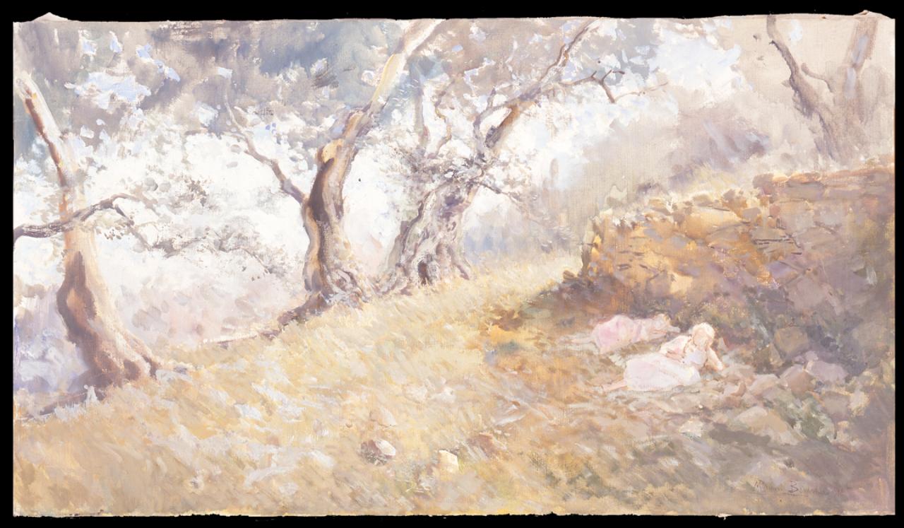 • NOTIZIE STORICO CRITICHE Il dipinto è da identificarsi probabilmente con il "Bosco di ulivi al tramonto", ugualmente datato, esposto alla Galleria Pesaro nel 1923 nell'ultima mostra personale tenuta dall'artista prima della sua scomparsa. Il dipinto risale al periodo ligure di Pompeo Mariani.