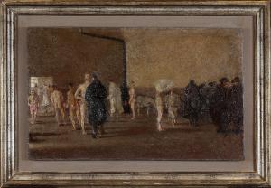 - NOTIZIE STORICO CRITICHE L’opera, risolta con una pittura di forte sintesi nelle figure, impaginate, come imprigionate in un interno male illuminato, tipico stanzone di vecchia caserma, trasmette una sensazione di cupa tensione. I rapporti spaziali tra le figure scure degli ufficiali medici irriconoscibili nei loro pastrani e quelle nude o seminude dei soldati esposti impietosamente, testimoniano esperienze che il pittore deve aver provato sulla propria pelle. Il dipinto è riferibile alla fine della prima guerra quando le leve dei giovanissimi erano chiamati al fronte.