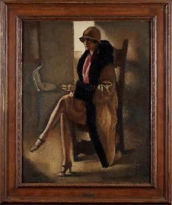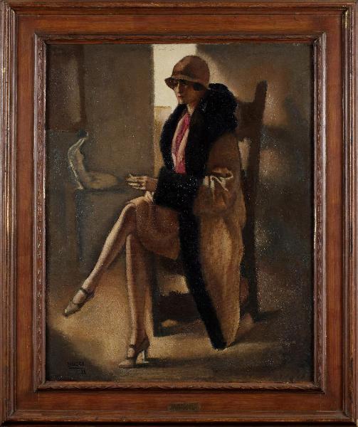 - NOTIZIE STORICO CRITICHE L’opera, ben scandita nel taglio geometrizzante, con l’allungamento delle gambe e il nudino femminile dell’amico ceramista marchigiano Enrico Mazzolani sullo sfondo, diventa icona elegante del Déco. La figura elegantissima si staglia all’interno di uno spazio dall’atmosfera silenziosa e sospesa, tipica del clima che caratterizza anche le opere di pittori come Donghi e Casorati. Affascinato dal ruolo di una donna moderna, bella e intellettualmente disinvolta, Bucci si dedica tra il terzo e il quarto decennio del Novecento a una serie di ritratti di celebrità milanesi, tra cui Ero Cacciguerra Giungi, Nardi Beltrame, Albertina Repaci, Gizi Braun, Nora Benelli, Duccio Nicodemi, il violoncellista Crepax, dipinti tutti presentati alla Galleria Pesaro di Milano. Nel 1929 Bucci espone il ritratto Rapuzzi Guelta come n. 7 della mostra a due con Aldo Carpi alla Galleria Pesaro.