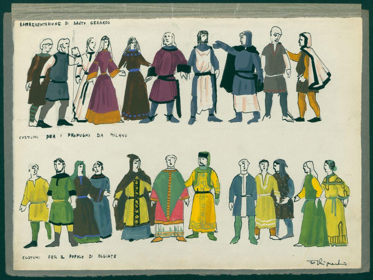 Figurini per costume di scena dello spettacolo "Il sacro mimo di Gerardo dei Tintori". costumi teatrali per profughi da Milano e popolo di Olgiate