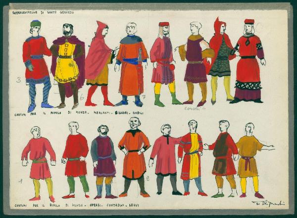 Figurini per costume di scena dello spettacolo "Il sacro mimo di Gerardo dei Tintori". costumi teatrali per il popolo di Monza, tra cui mercanti, signori, nobili, operai, contadini e servi