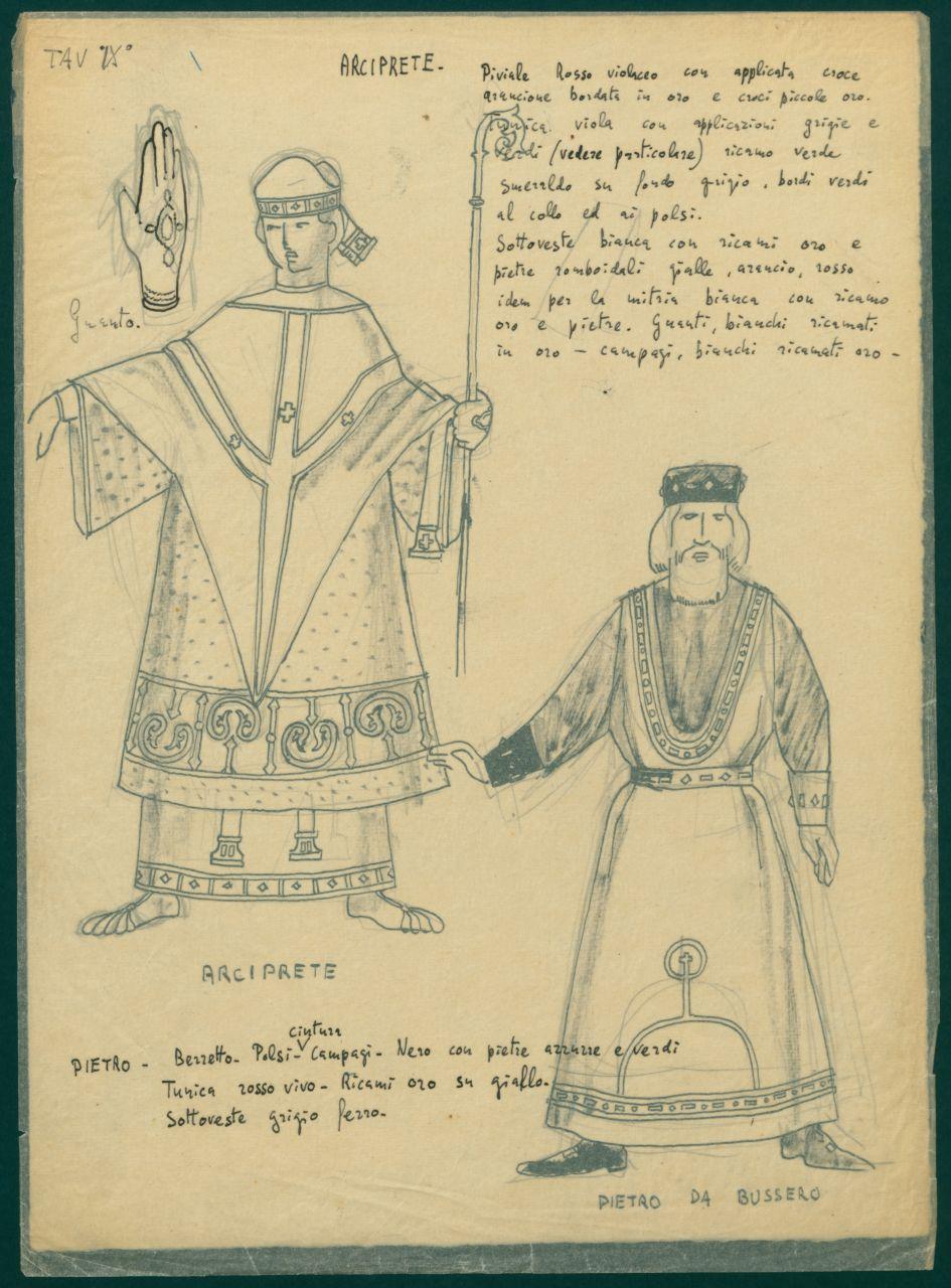 Figurini per costume di scena dello spettacolo "Il sacro mimo di Gerardo dei Tintori". costumi teatrali per arciprete e Pietro Bussero