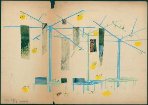 Disegno a grafite e pennarelli colorati realizzato su foglio di carta bianca. Sono presenti frammenti di carta stampata incollati sul foglio.