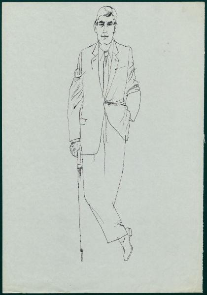 Disegno per annuncio pubblicitario per il reparto Uomo Moda maschile dei grandi magazzini la Rinascente. uomo in posa con abito elegante e bastone da passeggio