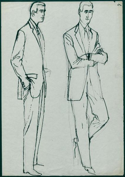Disegno per annuncio pubblicitario per il reparto Uomo Moda maschile dei grandi magazzini la Rinascente. uomini in posa con abiti eleganti