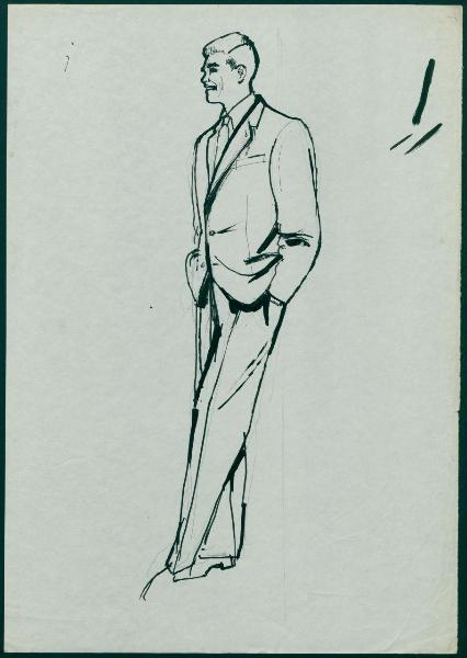 Disegno per annuncio pubblicitario per il reparto Uomo Moda maschile dei grandi magazzini la Rinascente. uomo in posa con abito elegante