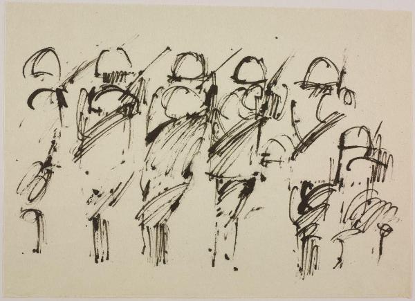 Disegno per mostra allestita alla Libreria Salto di Milano, 1961. truppa di militari schierati
