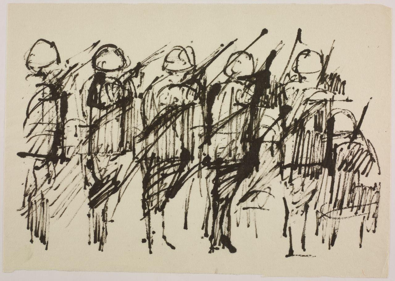 Disegno per mostra allestita alla Libreria Salto di Milano, 1961. truppa di militari schierati