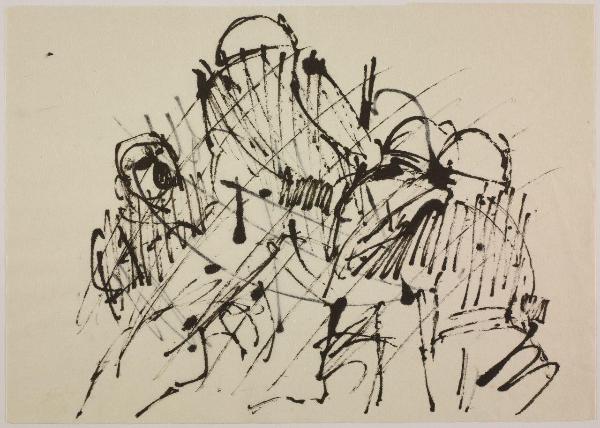 - NOTIZIE STORICO CRITICHE "Serie di immagini rapide, di strutture elastiche, in cui il peso diverso dei neri, e la composizione stabiliscono di volta in volta un movimentato equilibrio" [...] "Questi segni ci rivelano una trama di significati. File di elmetti, mani e bastoni alzati, braccia in atto di scagliare. Non simboli, ma qualcosa come la forma culminante di una situazione umana" [...] "In questi disegni qualcosa sta accadendo. Così non offrono un dato alla memoria, ma un oggetto all'emozione". Citazioni tratte dalla presentazione di Emilio Tadini alla mostra di disegni di Giancarlo Iliprandi alla Libreria Salto di Milano, 1961. L'ampio ciclo di disegni è stimolato dalla strage di Reggio Emilia del 7 luglio 1960, quando durante una manifestazione sindacale le violenze delle forze dell'ordine portarono alla morte di cinque operai. L'evento e l'ampio numero dei poliziotti impiegati, più di trecento, portarono Iliprandi a interrogarsi sulla violenza in una serie di disegni che sembrano seguire la radiocronaca dell'evento, con "movimenti di macchina" che si avvicinano e allontanano di continuo dalle scene del tumulto, focalizzandosi sulle masse, vuoi dei militari vuoi dei manifestanti, così come sui corpi a terra dei feriti e dei morti. Il disegno a china su carta di riso evidenzia l'urgenza espressiva e le possibilità drammatiche, evidenti soprattutto quando la scena è ridotta a poche chiazze d'inchiostro, oppure agli ultimi movimenti convulsi di un corpo disteso a terra. Scene di cronaca che evocano al contempo momenti universali e fuori dal tempo riferendosi più in generale alle lotte e alle violenze di tutti i tempi. L'ampio ciclo di disegni è realizzato per una mostra alla Libreria Salto di Milano. Da questa serie di opere Iliprandi ricava anche una più ampia riflessione sul rapporto tra grafica e disegno creando una sequenza d'immagini introdotta da un breve testo. Un materiale che sembrerebbe costituire una sezione speciale della stessa mostra: "sezione inutile per quanti sono esperti di codeste cose, militano in questo campo, ma utile forse per i profani, che sono sempre la maggioranza e che sanno così poco del nostro lavoro di ricerca". Lo stesso testo con una selezione d'immagini è poi pubblicato sulla rivista "Serigrafia" nel maggio-giugno 1963 con il titolo "Incontro fra la grafica e il disegno". Dopo un decennio di esperienze professionali dove la pittura e il disegno si intersecano con la grafica e la fotografia, Iliprandi crede di dover mettere a punto qualche considerazione, probabilmente stimolato anche nel vedere alla propria mostra una certa incapacità di leggere criticamente il disegno e constatare una sempre maggiore richiesta di specializzazione professionale.