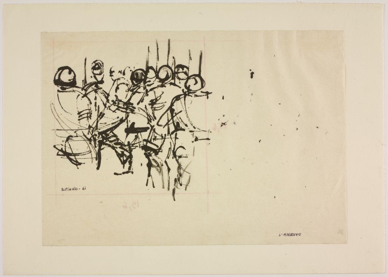- NOTIZIE STORICO CRITICHE "Serie di immagini rapide, di strutture elastiche, in cui il peso diverso dei neri, e la composizione stabiliscono di volta in volta un movimentato equilibrio" [...] "Questi segni ci rivelano una trama di significati. File di elmetti, mani e bastoni alzati, braccia in atto di scagliare. Non simboli, ma qualcosa come la forma culminante di una situazione umana" [...] "In questi disegni qualcosa sta accadendo. Così non offrono un dato alla memoria, ma un oggetto all'emozione". Citazioni tratte dalla presentazione di Emilio Tadini alla mostra di disegni di Giancarlo Iliprandi alla Libreria Salto di Milano, 1961. L'ampio ciclo di disegni è stimolato dalla strage di Reggio Emilia del 7 luglio 1960, quando durante una manifestazione sindacale le violenze delle forze dell'ordine portarono alla morte di cinque operai. L'evento e l'ampio numero dei poliziotti impiegati, più di trecento, portarono Iliprandi a interrogarsi sulla violenza in una serie di disegni che sembrano seguire la radiocronaca dell'evento, con "movimenti di macchina" che si avvicinano e allontanano di continuo dalle scene del tumulto, focalizzandosi sulle masse, vuoi dei militari vuoi dei manifestanti, così come sui corpi a terra dei feriti e dei morti. Il disegno a china su carta di riso evidenzia l'urgenza espressiva e le possibilità drammatiche, evidenti soprattutto quando la scena è ridotta a poche chiazze d'inchiostro, oppure agli ultimi movimenti convulsi di un corpo disteso a terra. Scene di cronaca che evocano al contempo momenti universali e fuori dal tempo riferendosi più in generale alle lotte e alle violenze di tutti i tempi. L'ampio ciclo di disegni è realizzato per una mostra alla Libreria Salto di Milano. Da questa serie di opere Iliprandi ricava anche una più ampia riflessione sul rapporto tra grafica e disegno creando una sequenza d'immagini introdotta da un breve testo. Un materiale che sembrerebbe costituire una sezione speciale della stessa mostra: "sezione inutile per quanti sono esperti di codeste cose, militano in questo campo, ma utile forse per i profani, che sono sempre la maggioranza e che sanno così poco del nostro lavoro di ricerca". Lo stesso testo con una selezione d'immagini è poi pubblicato sulla rivista "Serigrafia" nel maggio-giugno 1963 con il titolo "Incontro fra la grafica e il disegno". Dopo un decennio di esperienze professionali dove la pittura e il disegno si intersecano con la grafica e la fotografia, Iliprandi crede di dover mettere a punto qualche considerazione, probabilmente stimolato anche nel vedere alla propria mostra una certa incapacità di leggere criticamente il disegno e constatare una sempre maggiore richiesta di specializzazione professionale.