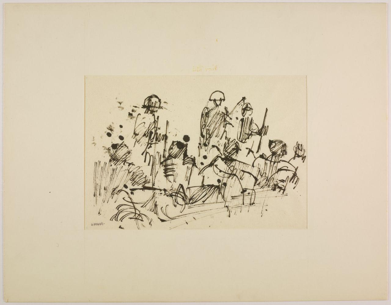 Disegno per mostra allestita alla Libreria Salto di Milano, 1961. militari e uomini seduti a terra