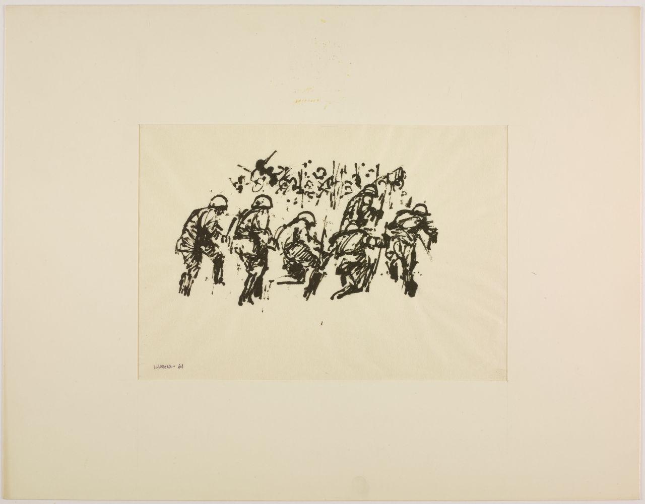 Disegno per mostra allestita alla Libreria Salto di Milano, 1961. truppa di militari in movimento