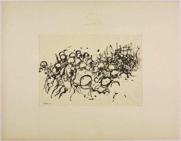Disegno per mostra allestita alla Libreria Salto di Milano, 1961. militari in combattimento