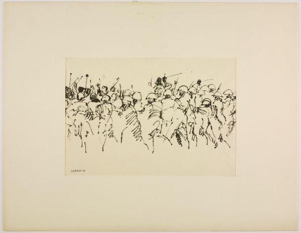 - NOTIZIE STORICO CRITICHE "Serie di immagini rapide, di strutture elastiche, in cui il peso diverso dei neri, e la composizione stabiliscono di volta in volta un movimentato equilibrio" [...] "Questi segni ci rivelano una trama di significati. File di elmetti, mani e bastoni alzati, braccia in atto di scagliare. Non simboli, ma qualcosa come la forma culminante di una situazione umana" [...] "In questi disegni qualcosa sta accadendo. Così non offrono un dato alla memoria, ma un oggetto all'emozione". Citazioni tratte dalla presentazione di Emilio Tadini alla mostra di disegni di Giancarlo Iliprandi alla Libreria Salto di Milano, 1961. L'ampio ciclo di disegni è stimolato dalla strage di Reggio Emilia del 7 luglio 1960, quando durante una manifestazione sindacale le violenze delle forze dell'ordine portarono alla morte di cinque operai. L'evento e l'ampio numero dei poliziotti impiegati, più di trecento, portarono Iliprandi a interrogarsi sulla violenza in una serie di disegni che sembrano seguire la radiocronaca dell'evento, con "movimenti di macchina" che si avvicinano e allontanano di continuo dalle scene del tumulto, focalizzandosi sulle masse, vuoi dei militari vuoi dei manifestanti, così come sui corpi a terra dei feriti e dei morti. Il disegno a china su carta di riso evidenzia l'urgenza espressiva e le possibilità drammatiche, evidenti soprattutto quando la scena è ridotta a poche chiazze d'inchiostro, oppure agli ultimi movimenti convulsi di un corpo disteso a terra. Scene di cronaca che evocano al contempo momenti universali e fuori dal tempo riferendosi più in generale alle lotte e alle violenze di tutti i tempi. L'ampio ciclo di disegni è realizzato per una mostra alla Libreria Salto di Milano. Da questa serie di opere Iliprandi ricava anche una più ampia riflessione sul rapporto tra grafica e disegno creando una sequenza d'immagini introdotta da un breve testo. Un materiale che sembrerebbe costituire una sezione speciale della stessa mostra: "sezione inutile per quanti sono esperti di codeste cose, militano in questo campo, ma utile forse per i profani, che sono sempre la maggioranza e che sanno così poco del nostro lavoro di ricerca". Lo stesso testo con una selezione d'immagini è poi pubblicato sulla rivista "Serigrafia" nel maggio-giugno 1963 con il titolo "Incontro fra la grafica e il disegno". Dopo un decennio di esperienze professionali dove la pittura e il disegno si intersecano con la grafica e la fotografia, Iliprandi crede di dover mettere a punto qualche considerazione, probabilmente stimolato anche nel vedere alla propria mostra una certa incapacità di leggere criticamente il disegno e constatare una sempre maggiore richiesta di specializzazione professionale.