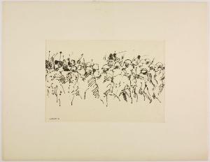 Disegno per mostra allestita alla Libreria Salto di Milano, 1961. militari colpiscono degli uomini